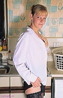 Carla is wearing a white blouse, black stockings, black thong and black heels. She smokes and opens her shaven and wet pussy.