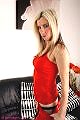 Izzie is here pictured in her flat wearing a red top, a red pvc skirt, fishnet pantyhose and black pvc thigh boots.
