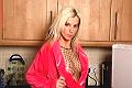 Izzie is shown here in the kitchen. She is wearing black fishnet pantyhose, a pink hooded robe and heels.