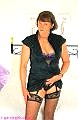Jill is wearing a black dress, black basque, black thong, stockings and high heels.