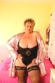 Julia here is wearing a pink satin robe, black stockings and a black body thingie which she soon flips her tits out of.