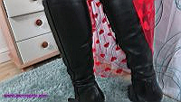 Lucy Gresty in leather thigh boots, sheer tights, no underwear and red negligee.