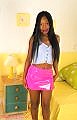 Marissa is wearing a pink pvc skirt, little blue top, yellow thong and heels.