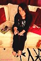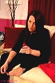 Nicole is posing on a cream sofa wearing only track suit bottoms, a black top and a black and pink thong.