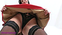 Roxy in a short red skirt black holdups and heels bends over to show us her bum and then gives us some nice upskirt views.