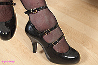 Sadie in srockings and strappy heels posing at her desk and showing her see through knickers.