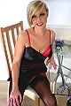 Sexy Scarlet is posing here on a glass table wearing a short cerise evening dress, black fully fashioned stockings, black high heels and a sexy black thong. This set starts off with glimpses of Scarlets stockings tops, then the camera moves low down to look up her dress and view her little black thong framed by her black stockings.