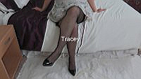 Tracey in black stockings and heels showing some cleavage and teasing but she can't resist getting her tits out and very nice they are. Some nipple tweaking and breast squeezing close ups then we are on to very wide and explicti arse spreading.